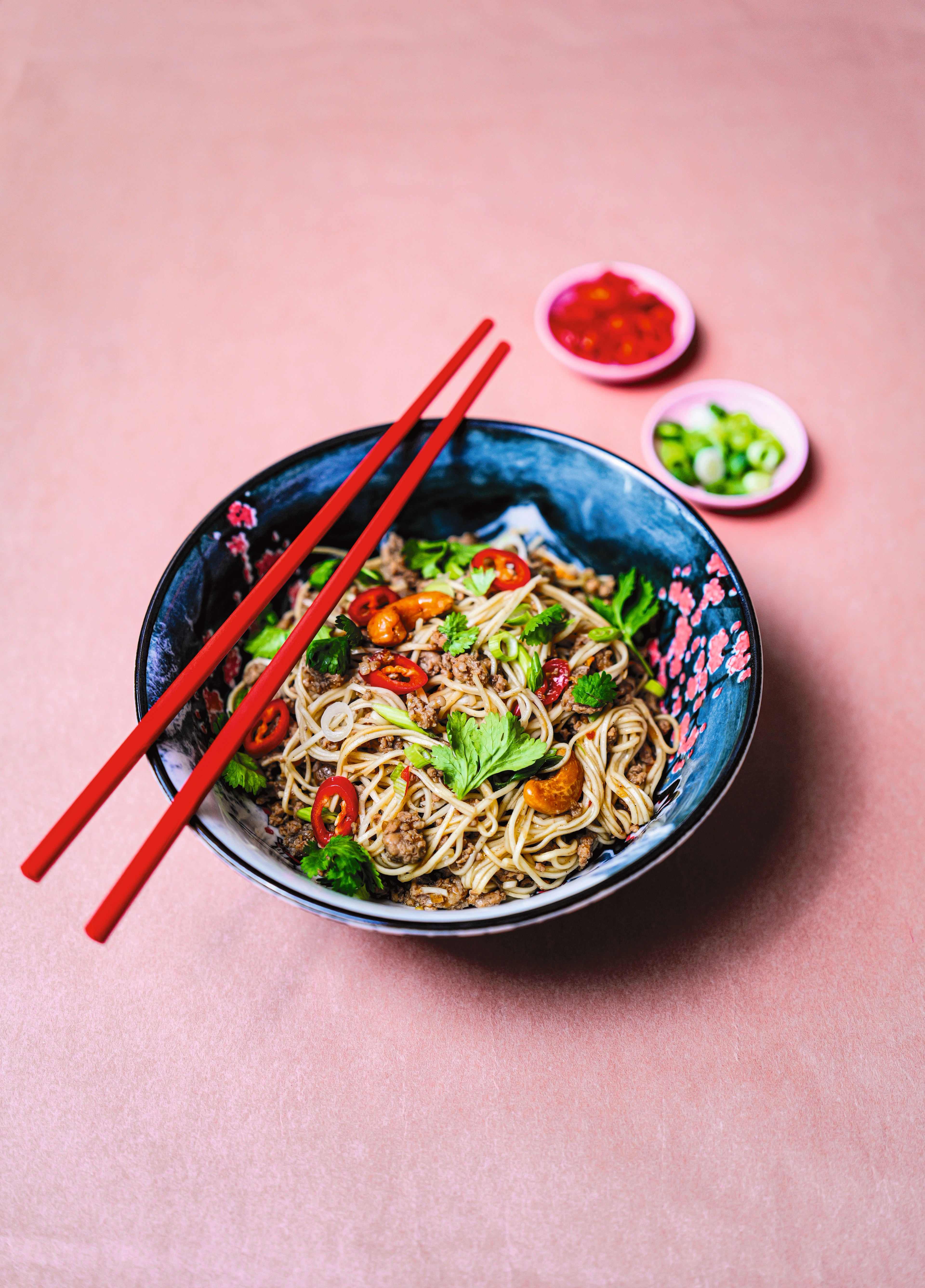 Dette er nudlene som sparker fra seg! Mengden chili bestemmer du selv, men personlig liker jeg det litt hett. Jeg bruker også en krydderblanding jeg håper du vil bli bedre kjent med. Five spice, eller kinesisk femkrydder, består av stjerneanis, kanel, nellik, fennikel og sichuan-pepper. Dette er selve smaken av kinesisk mat, men du finner den samme miksen også i andre asiatiske land.