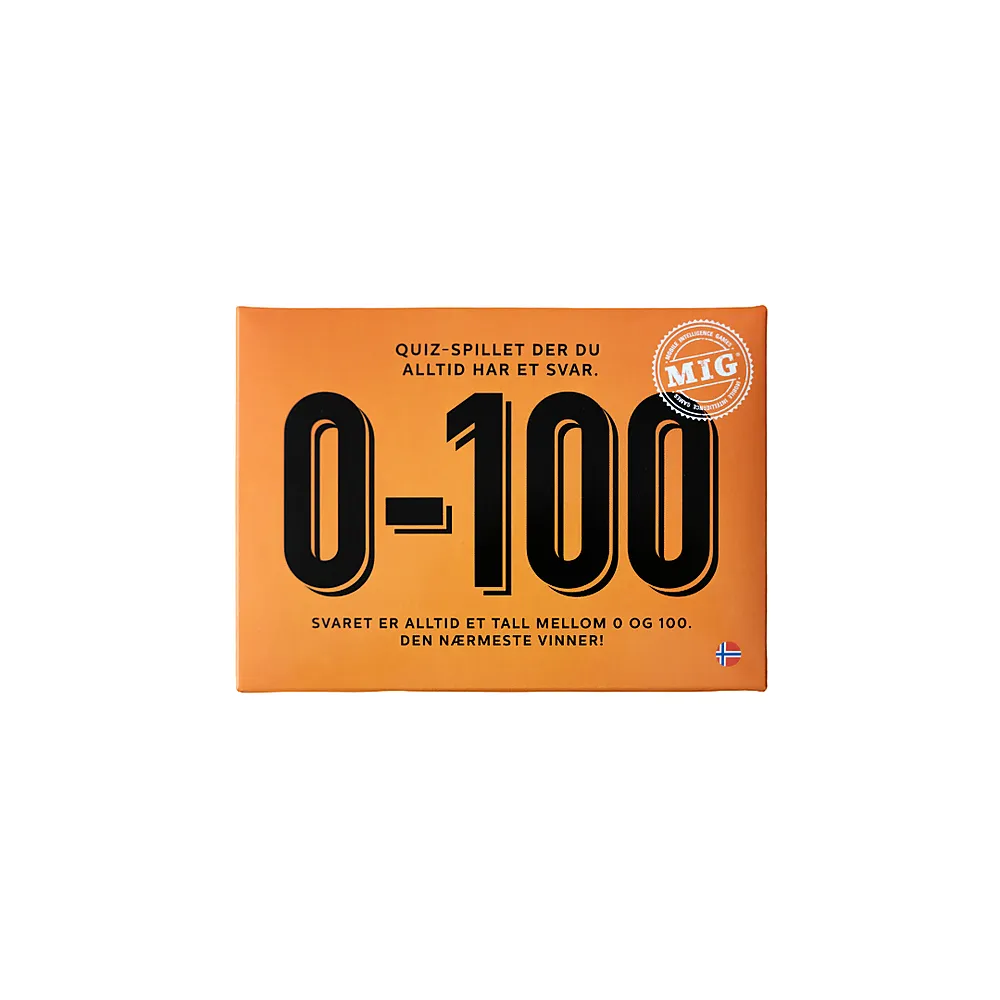 0–100 Oransje (NO) er en ny utgave av det populære spørrespillet der det gjelder å plassere svar på en skala fra 0 til 100. Spillet kombinerer kunnskap og diskusjon, og passer godt for både familie og venner. Dette er et spill som egner seg godt til sosiale spillkvelder, der praten rundt bordet er like viktig som poengene.
