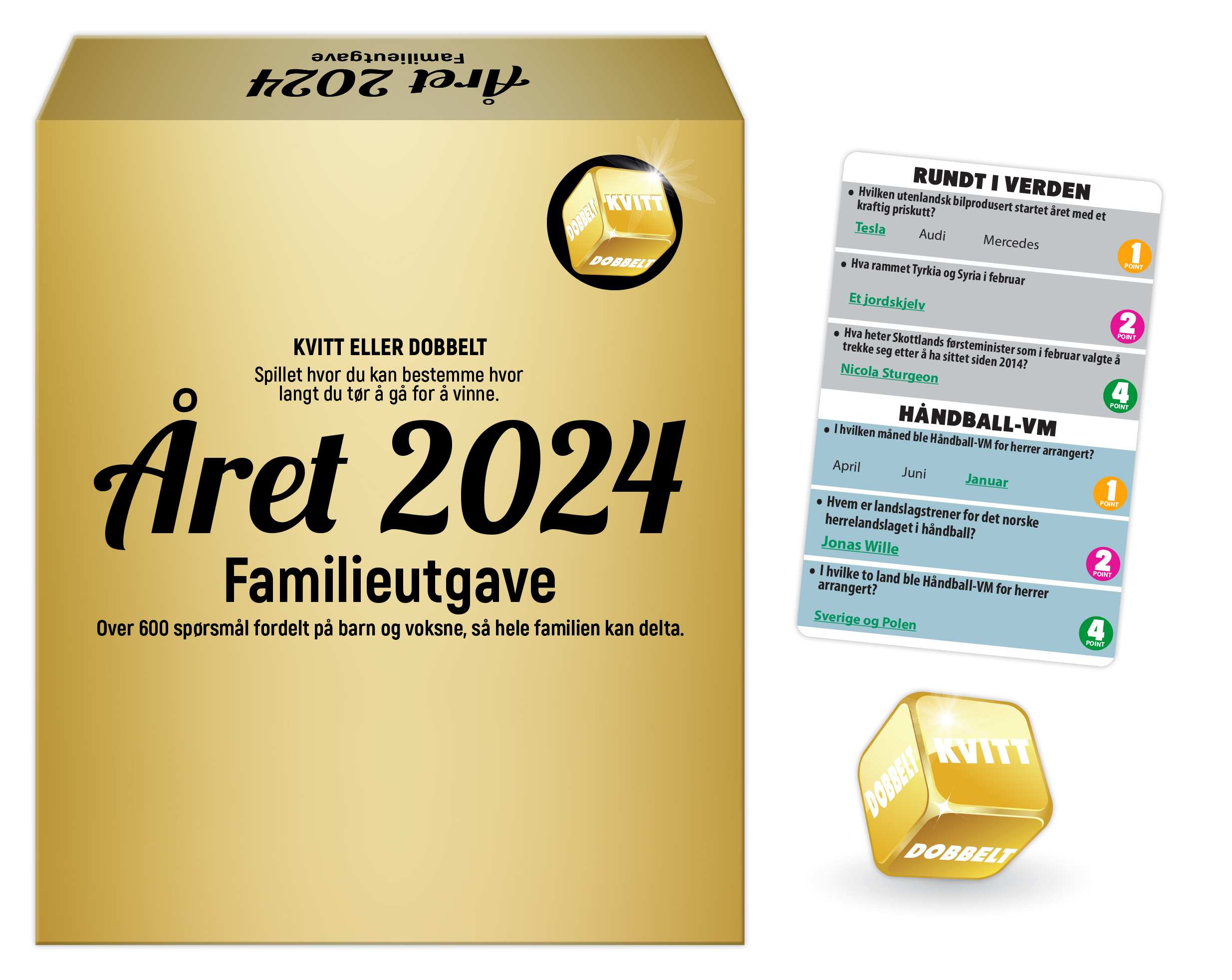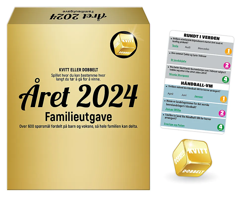 Med Året 2024 - Familieutgave kan hele familien konkurrere og teste sin kunnskap om alt som har skjedd i 2024! Dette spennende spillet byr på over 600 spørsmål som dekker et bredt spekter av temaer, fra kongehuset og sport til politikk, film, musikk og mer. Spørsmålene er delt opp for barn (fra 10 år) og voksne, slik at alle kan delta på sine egne nivåer.