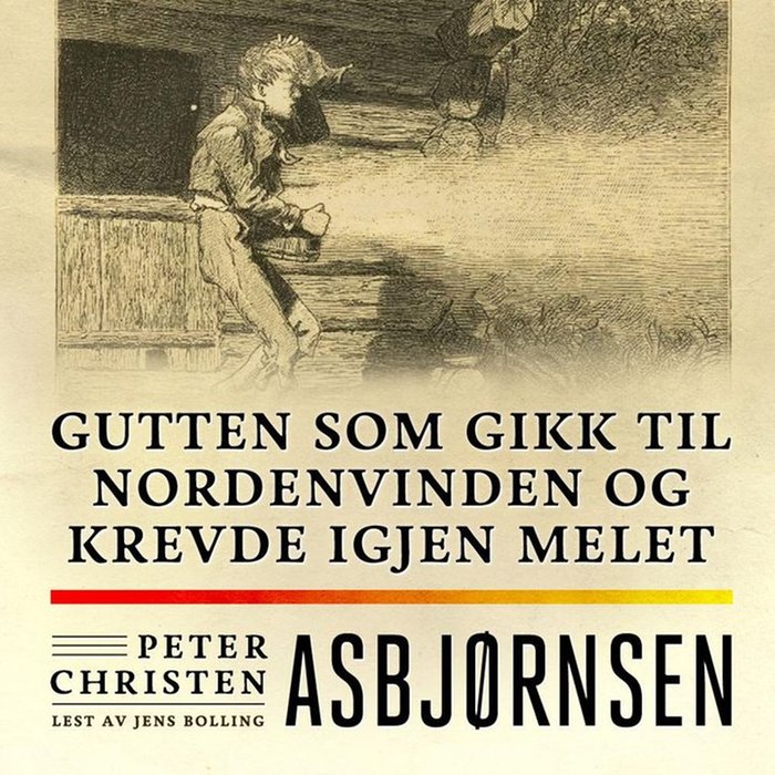 "Det var engang en gammel kone som hadde en sønn; hun var ussel og skrøpelig, og så skulle gutten, sønnen hennes, gå på stabburet for henne etter grøtmel til middags. Men da han steg ut igjen på stabburstrappen, så kom nordenvinden rykende, tok melet fra ham og fór ende til værs med det. Gutten gikk på stabburet etter mer, men da han steg ut på trappen, kom nordenvinden fykende igjen og tok melet fra ham; og slik gikk det tredje gangen også. Dette ble gutten harm for, og han syntes det var urimelig at nordenvinden skulle fare slik fram, og så tenkte han han fikk lete ham opp og kreve melet tilbake."