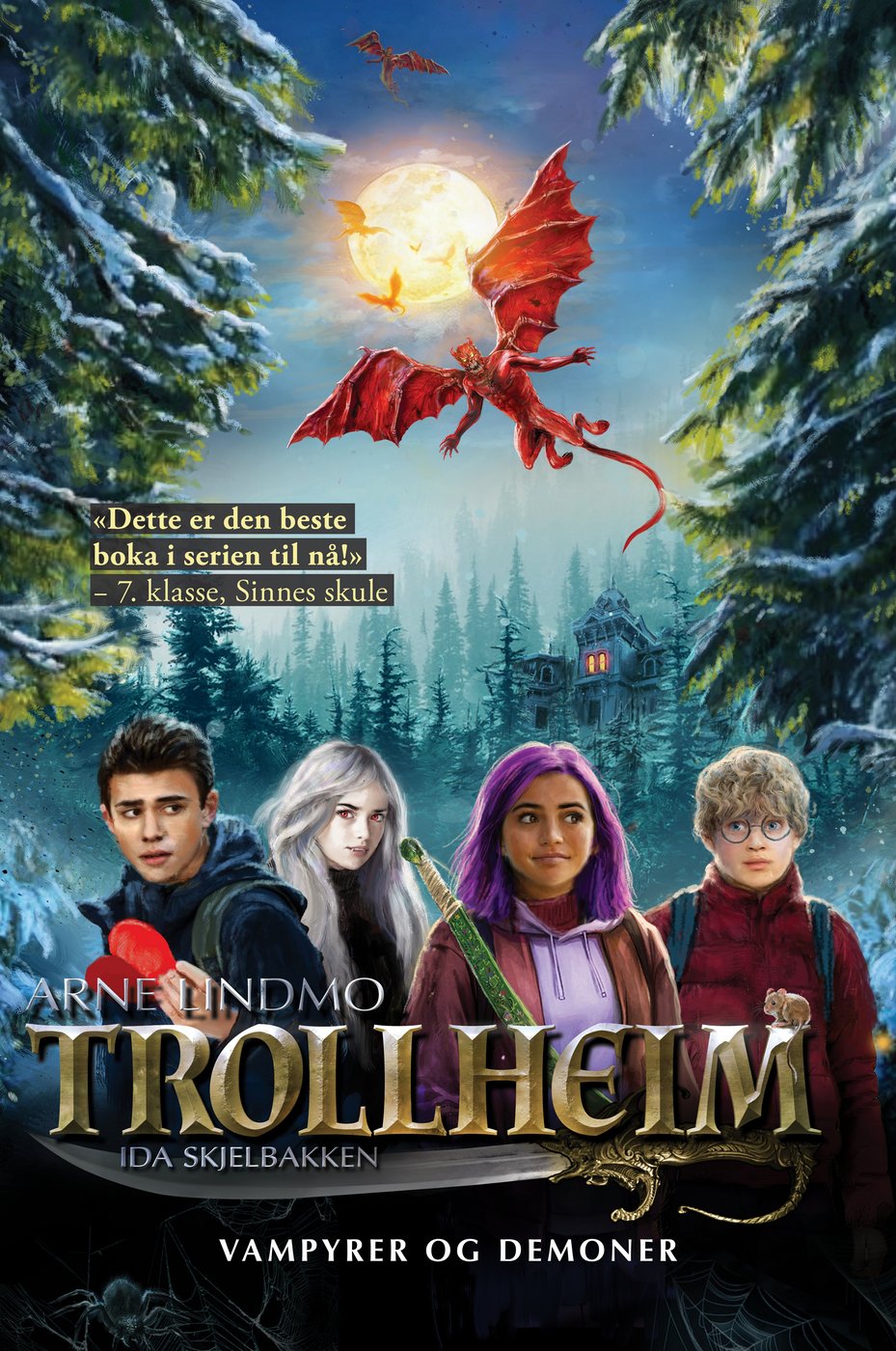 Adam, Tara og Tobias har fått en ny venn, men hun er vampyr og har ikke vært på overflata på 200 år! Klarer de å holde identiteten hennes hemmelig? Vil hun passe inn på skolen? Og klarer de å hindre henne fra å myrde de slemme bøllene i klassen? Problemene blir verre og verre, spesielt når klassens superstjerne forelsker seg i Adam. Hun skyr ingen midler for å vinne hjertet hans, inkludert avtaler med de mørkeste makter ... Den første boken i serien, «TROLLHEIM - Kråkeslottets hemmelighet» vant Arks barnebokpris! I juryen satt 10 000 femte- og sjette-klassinger som kåret den til årets beste bok! Det ordet som gikk mest igjen i juryens begrunnelse var at boken var så SPENNENDE. «Vampyrer og demoner er den beste boka i serien til nå!» - 7. klasse på Sinnes skule Illustratør av TROLLHEIM-bøkene, Ida Skjelbakken, vant Kulturdepartementets pris for beste illustrasjoner! «Hun som har laget tegningene til disse bøkene må ha magiske farger og blyanter!» - Beren og Heidi, 10 år «Det er faktisk vanskelig å finne så gode bokserier!» - Oskar, 10 år Bøkene i TROLLHEIM-serien er nå trykket i 45 000 eksemplar: Bok1: TROLLHEIM - Kråkeslottets hemmelighet Bok 2: TROLLHEIM - Hevneren fra Helheim Bok 3: TROLLHEIM - Underjordisk oppdrag Bok 4: TROLLHEIM - Vampyrer og demoner