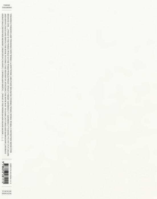 VERSIONS (...) er en bok bestående av nye arbeider som behandler og resirkulerer kunstnerens tidligere verk. Tandberg beskriver dette selv som å: " være midt i en loop. Jeg jobber med eldre arbeider, rent fysisk, tar tak i ting fra lageret og resirkulerer dem til nye verk." Boken er ved første øyekast et møte med en kunstners destruksjon av egen kunst. Tandbergs gamle arbeider blir skutt i filler, malt over, paint-ball'et - bøker blir skulpturer, fotografier malerier og tekster til bilder. Men å lese ødeleggelsen av det gamle gjennom det nye blir meningsløst. De nye verkene er ikke en erkjennelse av de gamle er avvist, det er heller en åpenbaring av det eksisterende som noe nytt - en erkjennelse av at kanskje alt er i repetisjon, at selv versjoner har sin versjon. . Boken er både en oversikt over hvor Tandberg står kunstnerisk i dag og en artist book med verk laget unikt for boken. Den inneholder også nyskrevne tekster av Karin Gundersen, Matias Faldbakken, Lars Bang-Larsen og Peter Amdam. Vibeke Tandberg er blant Norges fremste billedkunstnere. Hun har hatt en lang rekke galleri- og institusjonsutstillinger i inn- og utland. VERSIONS (...) er hennes femte monografi/artist book og hennes første bok på kunstbokforlaget Teknisk Industri.