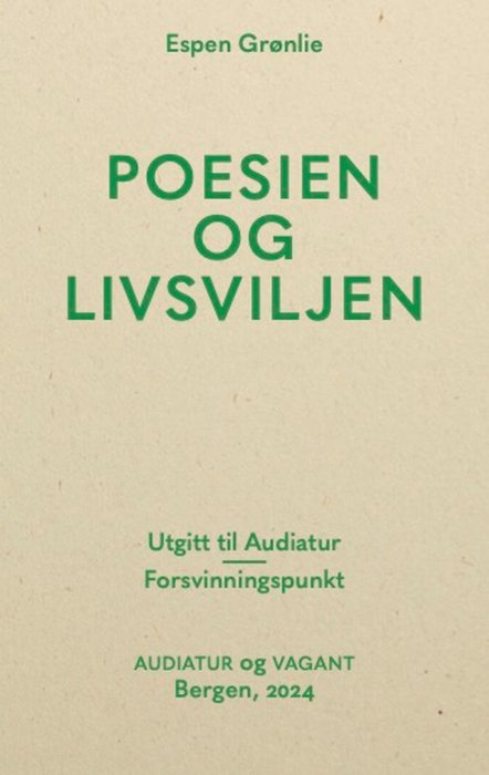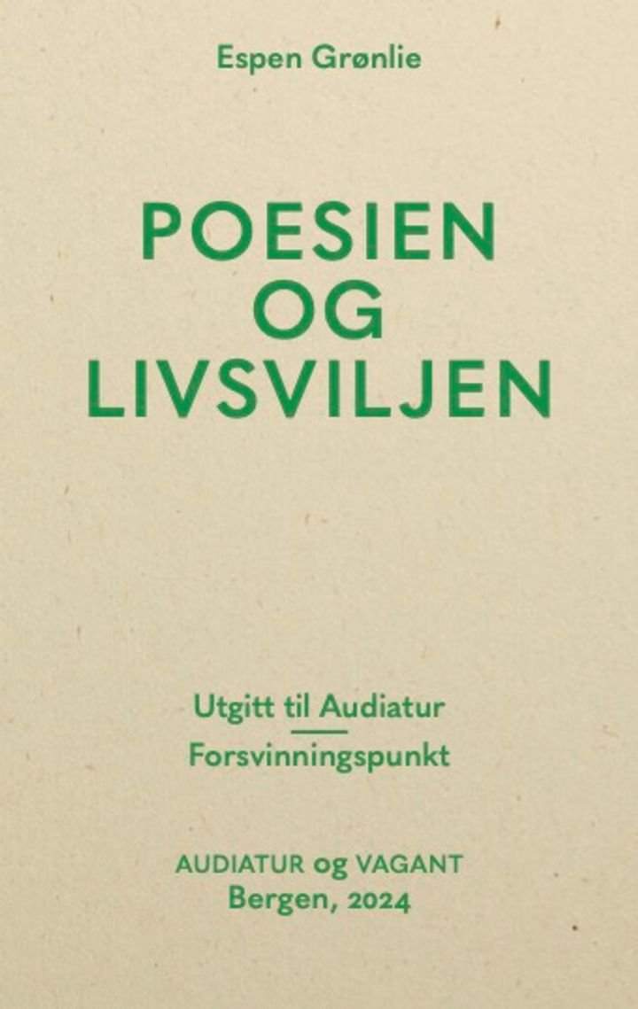Tradisjonen tilsier at Tor Ulven og Olav Nygard var dødens diktere. Men det er motsatt: De to er livets diktere. I denne boka går Espen Grønlie på jakt etter Ulvens humor og ømhet, på streiftog i Nygards dirrende univers av sang og klang, i kulturkamp med Arne Garborg og på tokt i det ubevisste med poesien som anfører. Poesien og livsviljen er et bidrag til den språklige verdenskonserten.