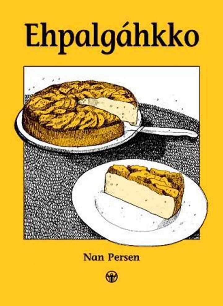 Hefte med oppskrift på eplekake. Oppskriften presenteres trinn for trinn, ved hjelp av kort tekst og illustrasjoner i svart-hvitt. Trykt på vannavstøtende papir.
