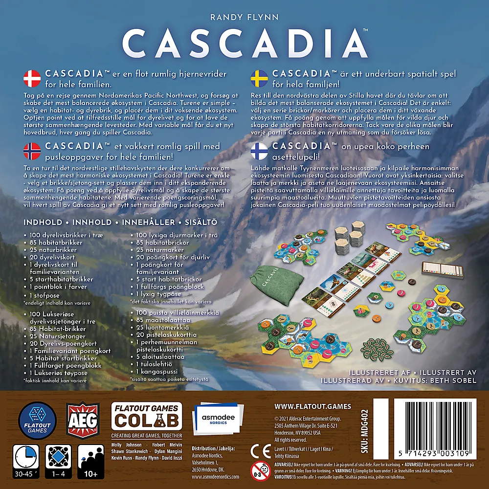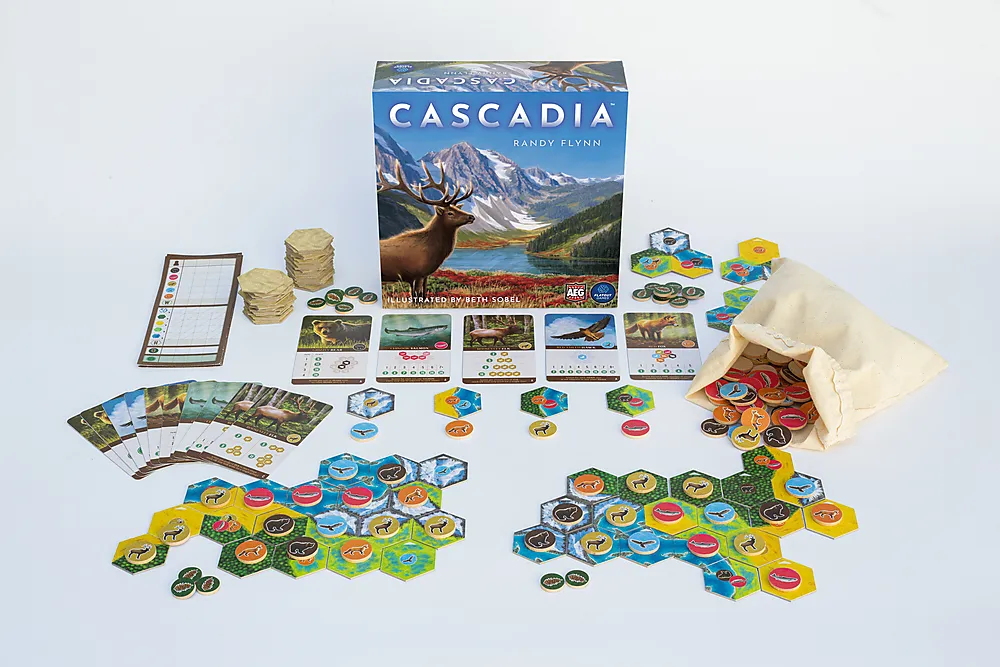 Cascadia er et tegningsspill for fliser og symboler for 1-4 spillere. Det involverer et tolags puslespill som utvikler seg over tid ettersom flere habitater og dyreliv legges til hver spillers individuelle økosystem. Spillere scorer poeng ved å skape de mest harmoniske romlige arrangementene av dyrelivet, og også ved å lage de største sammenhengende habitatkorridorene.