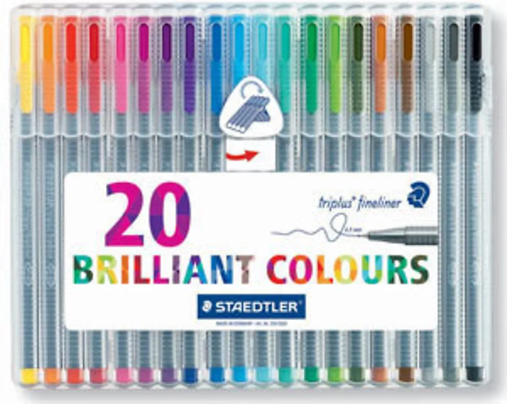 Ergonomisk riktig trekantet fiberpenn med Dry Safe blekk som gjør at den kan ligge i flere dager uten å tørke. Strekbredde 0,3 mm. Etui med 20 penner i assorterte farger.