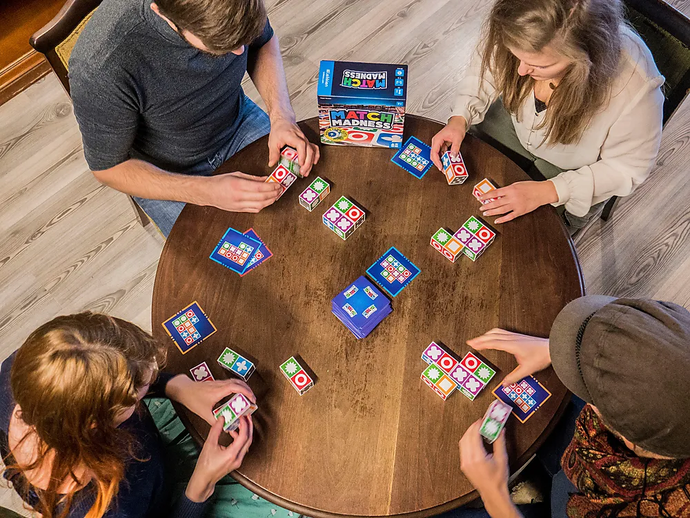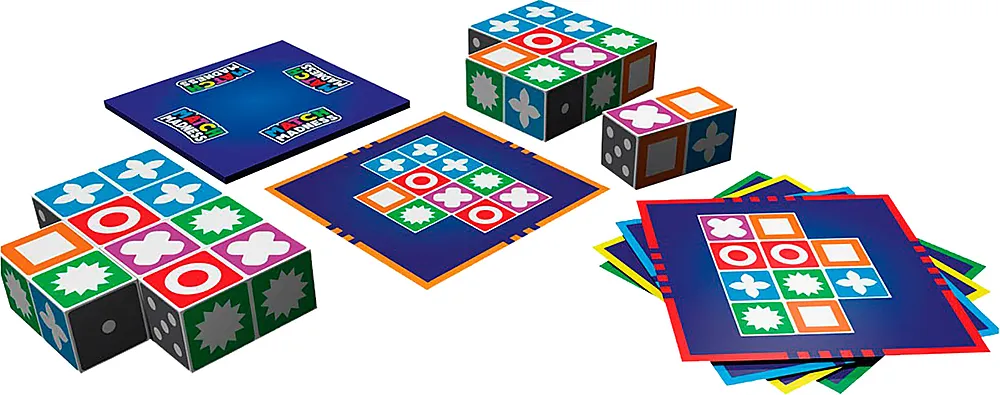 Er du kjapp i tankegangen og god til å se mønstre, eller vil du bare være den raskeste? Da er Match Madness spillet for deg. Dette populære familiespillet blir fort en gjenganger på bordet når det først testes. Dere konkurrere om å være den raskeste til å gjenskape mønsteret på kortet med blokkene dine mønsteret for å vinne kortet. Spilleren med flest kort på slutten av spillet er vinneren. Hver spiller har et sett med 5 blokker nummerert 1 til 5. Etter å ha blandet stokken med mønsterkort, bestemmer spillerne hvor mange runder de ønsker å spille og tar samme antall mønsterkort fra toppen av stokken. Disse kortene legges deretter med forsiden ned i midten av bordet. Det øverste kortet fra kortstokken snus og viser et mønster. Alle spillere kjemper for å matche, med blokkene sine, mønsteret som vises på kortet. Den første spilleren som matcher mønsteret griper kortet og viser til de andre spillerne at konfigurasjonen av blokkene deres samsvarer med mønsteret på kortet. Hvis spilleren har rett, beholder de kortet. Et nytt kort snus og en ny runde begynner. Spillet avsluttes når dere har vært igjennom alle de avtalte antall kort. Spilleren med flest kort vinner. I tilfelle uavgjort vinner spilleren med flest nivå 5-kort (røde).