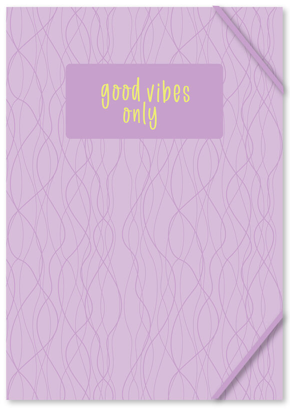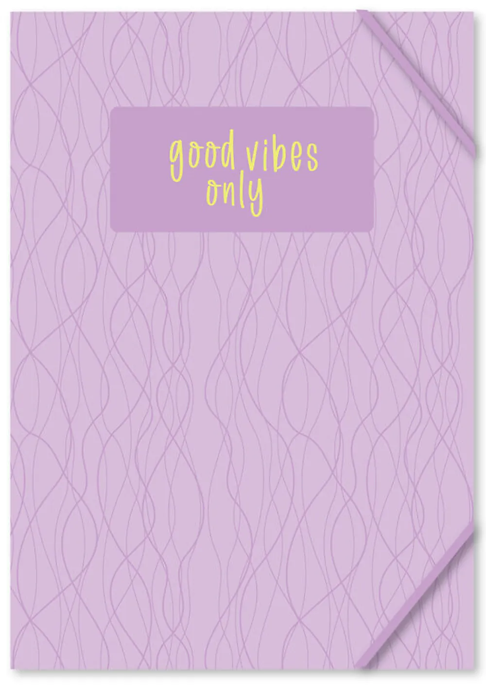 Strikkmappe i flotte lilla pastellfarger med teksten "good vibes only".Fin oppbevaring til viktige dokumenter.