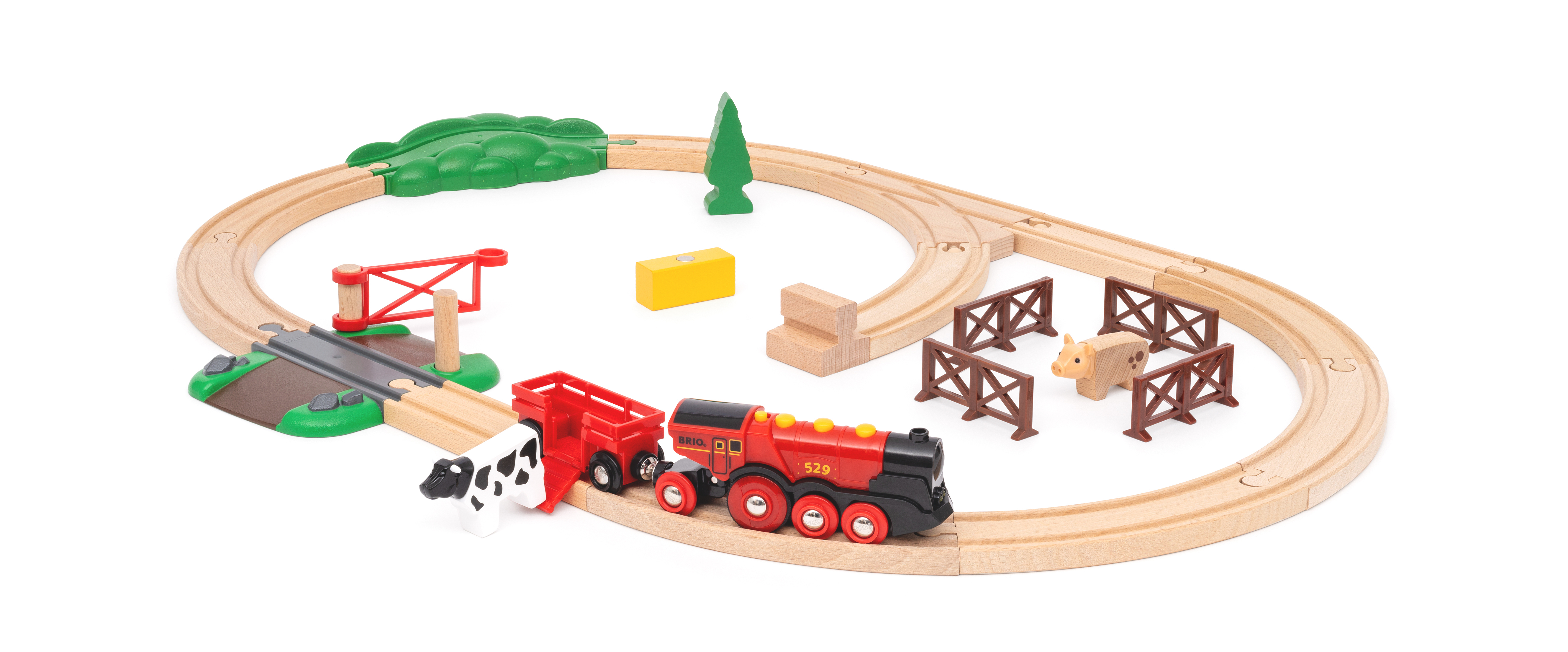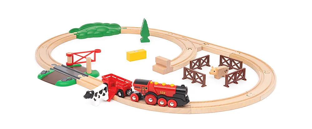 Dette 24-delte togsettet tilbyr en landlig lekearena hvor barna kan laste opp høyet, mate den sultne grisen og kua på jordet, og ta dem med på et eventyr langs BRIOs klassiske togskinner i tre.
