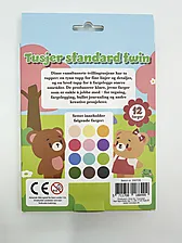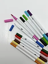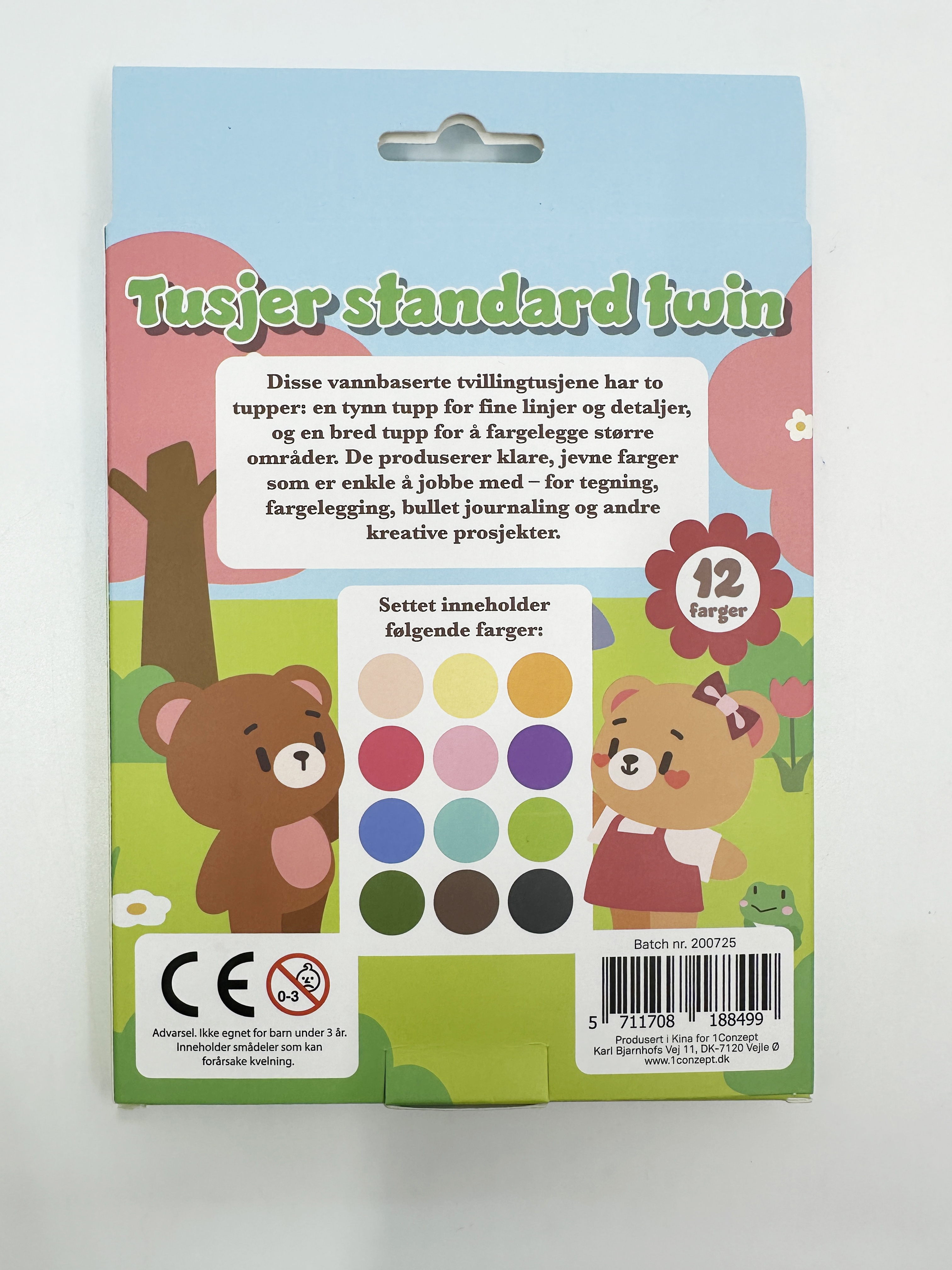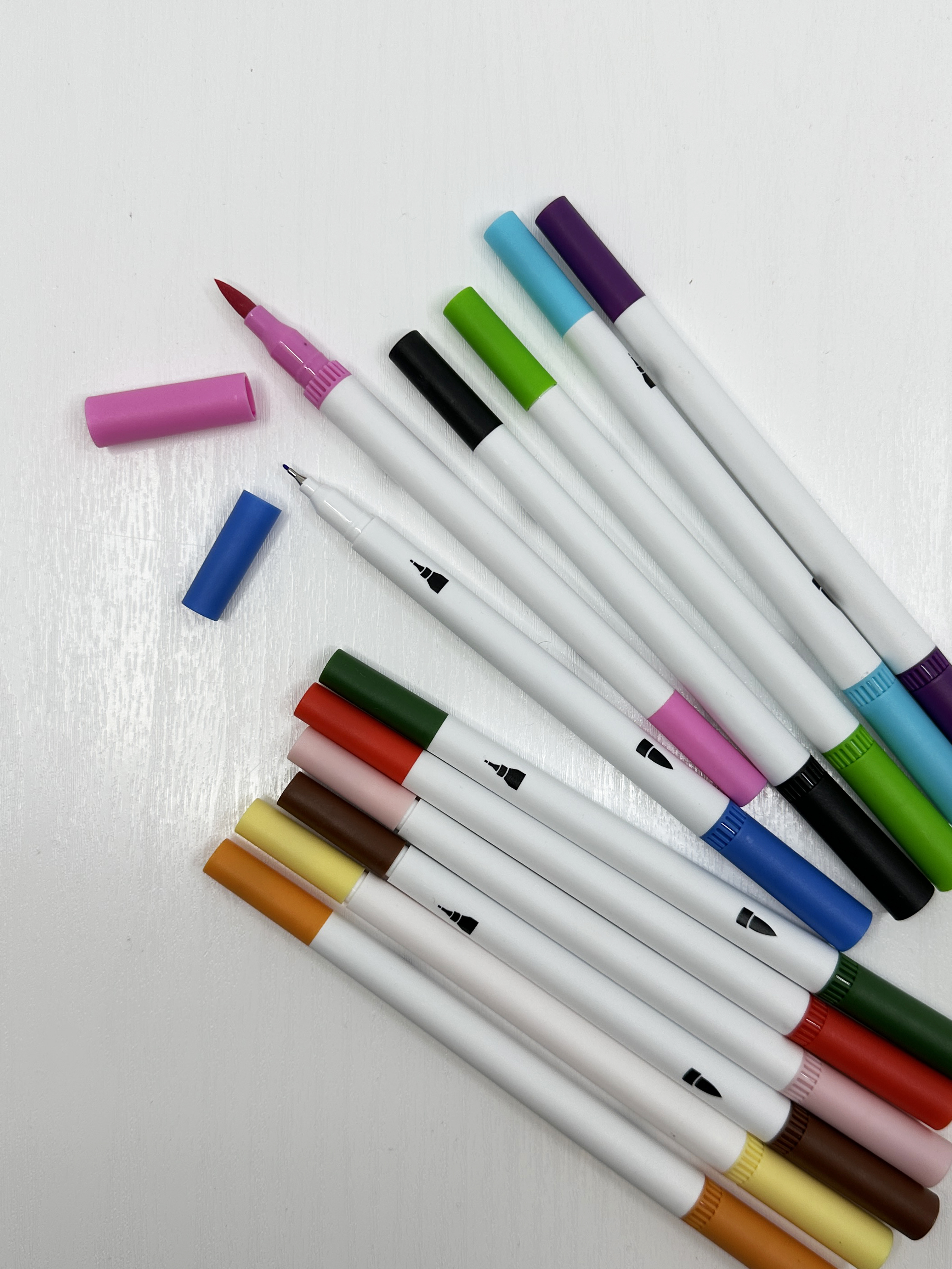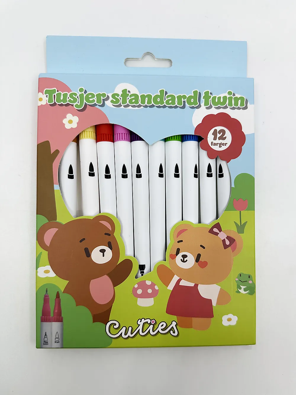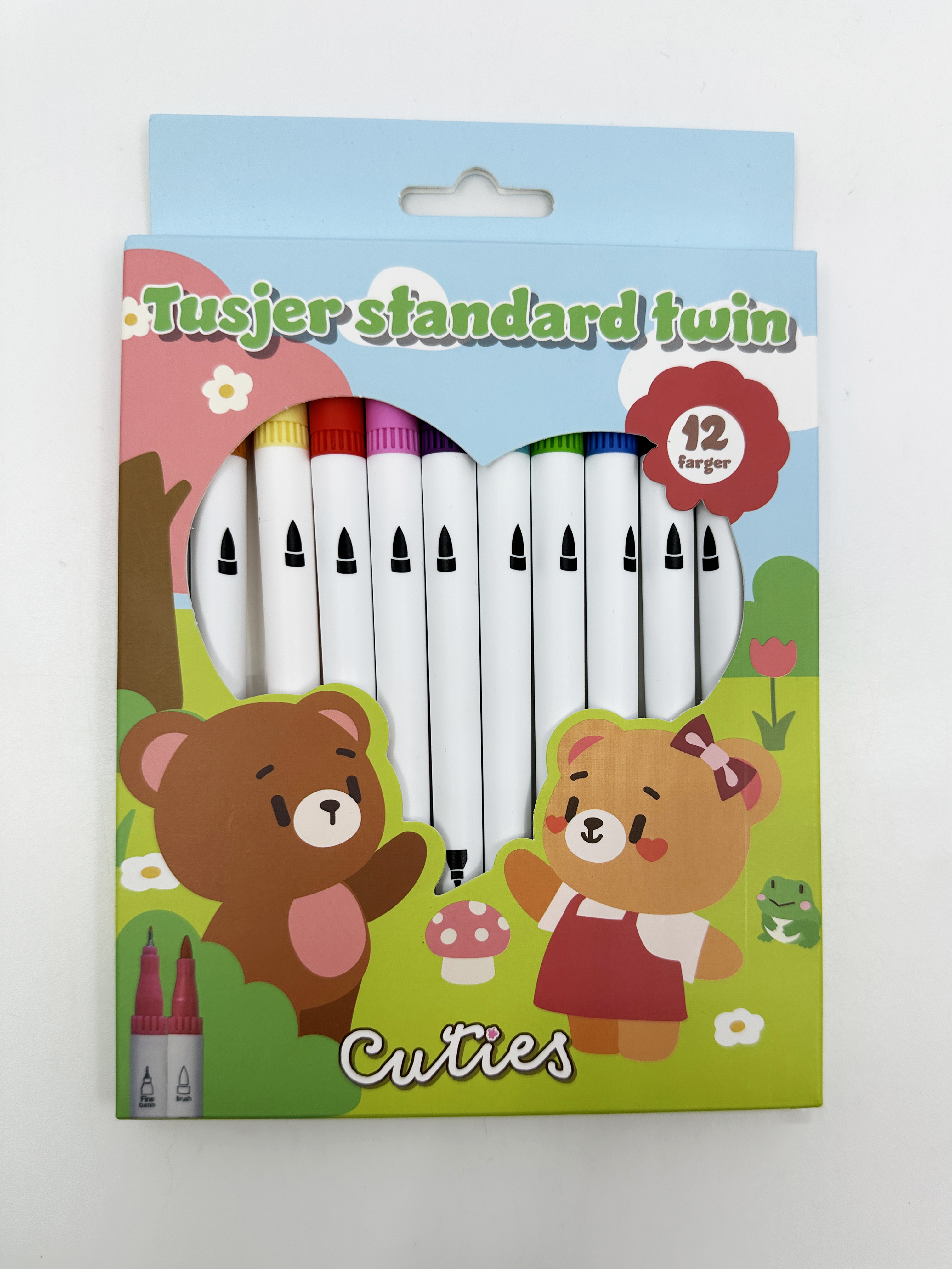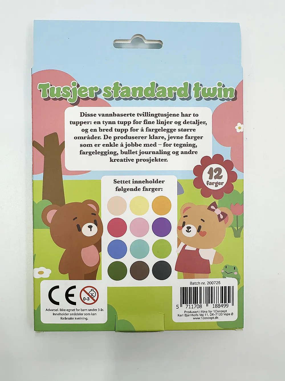 Dette settet inneholder 12 vannbaserte tvillingtusjer med to ulike tupper. Den tynne tuppen egner seg for fine linjer, detaljer og skriving, mens den brede tuppen passer til fargelegging av større områder.